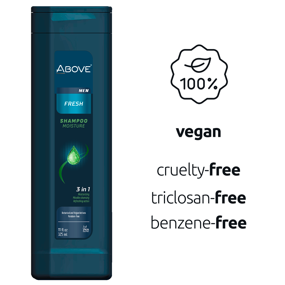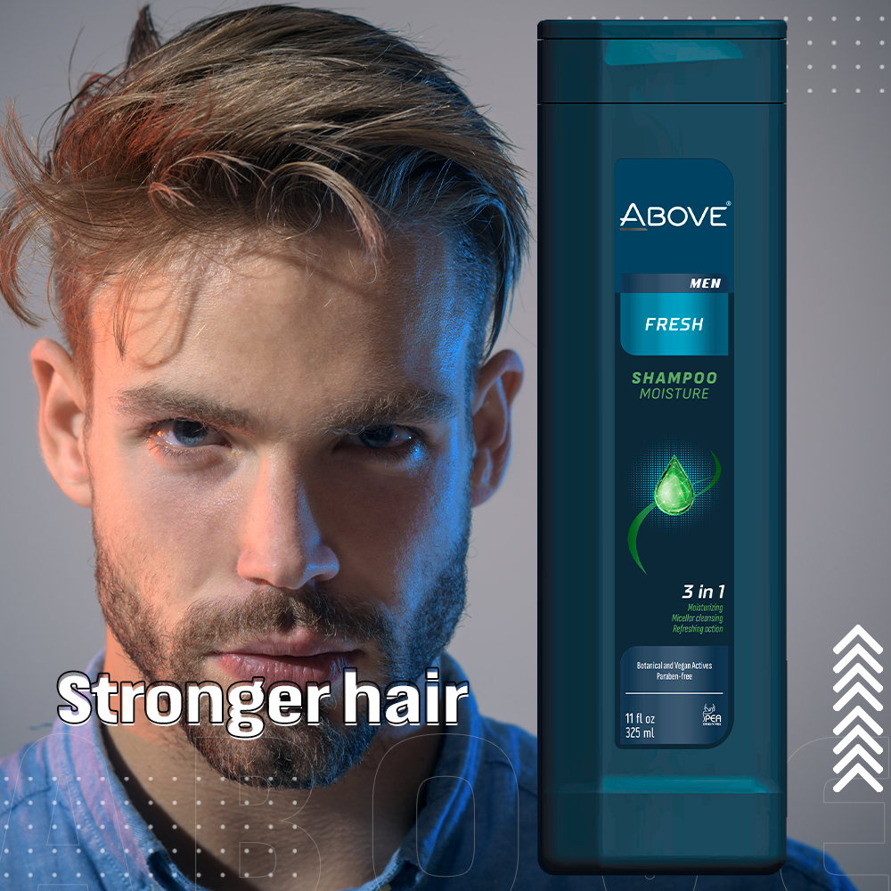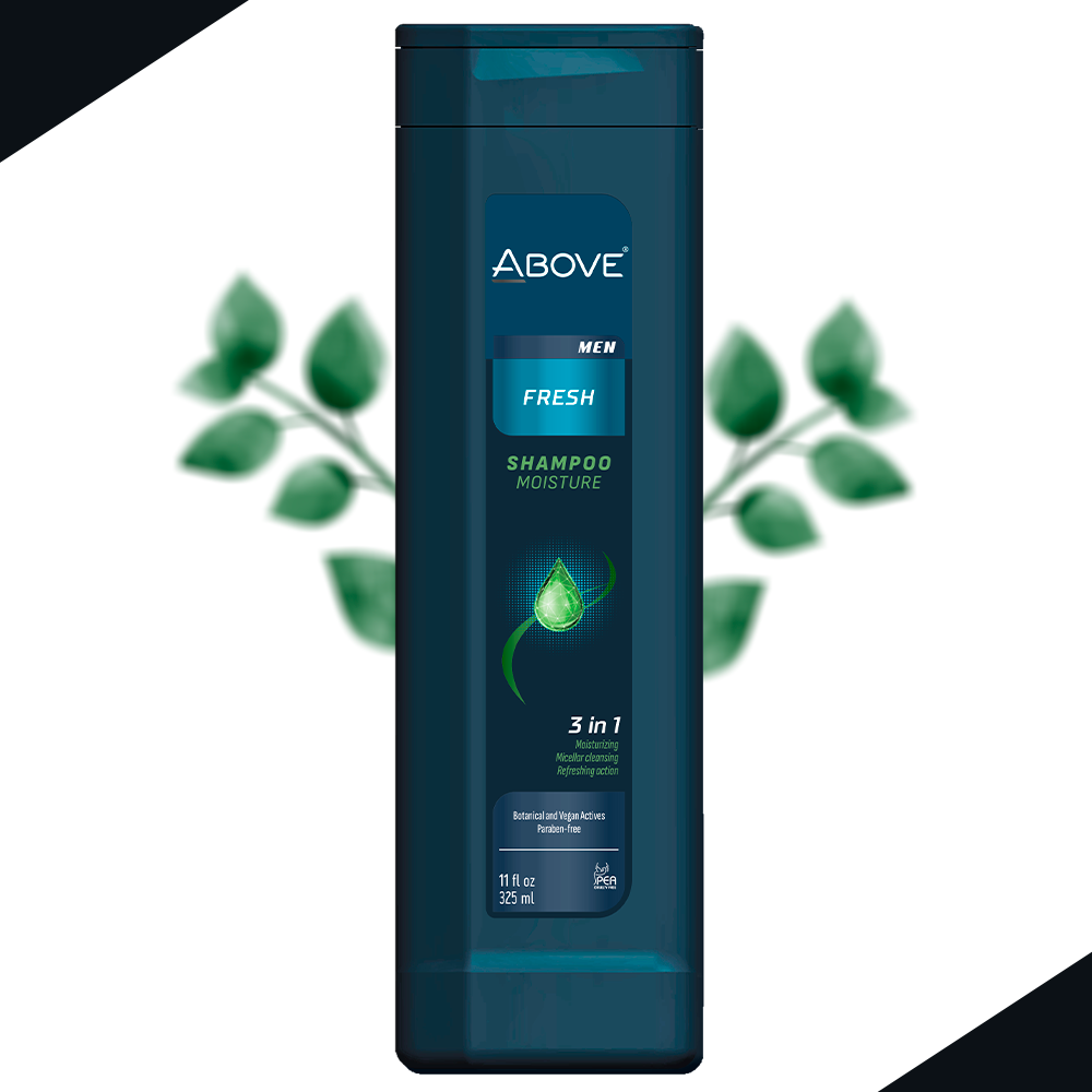 Above's Fresh Men Shampoo has been specially developed for dry, brittle and damaged hair. Its exclusive 3-in-1 formula contains active ingredients that provide hydration, micellar cleansing and refreshing action, leaving the scalp clean and the hair healthy and shiny.