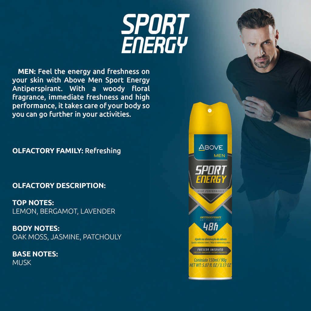 Feel the energy and freshness on your skin with Above Men Sport Energy Antiperspirant. With a woody floral fragrance, immediate freshness and high performance, it takes care of your body so you can go further...