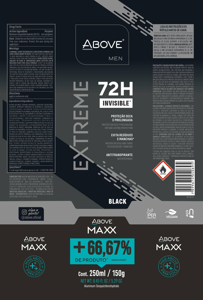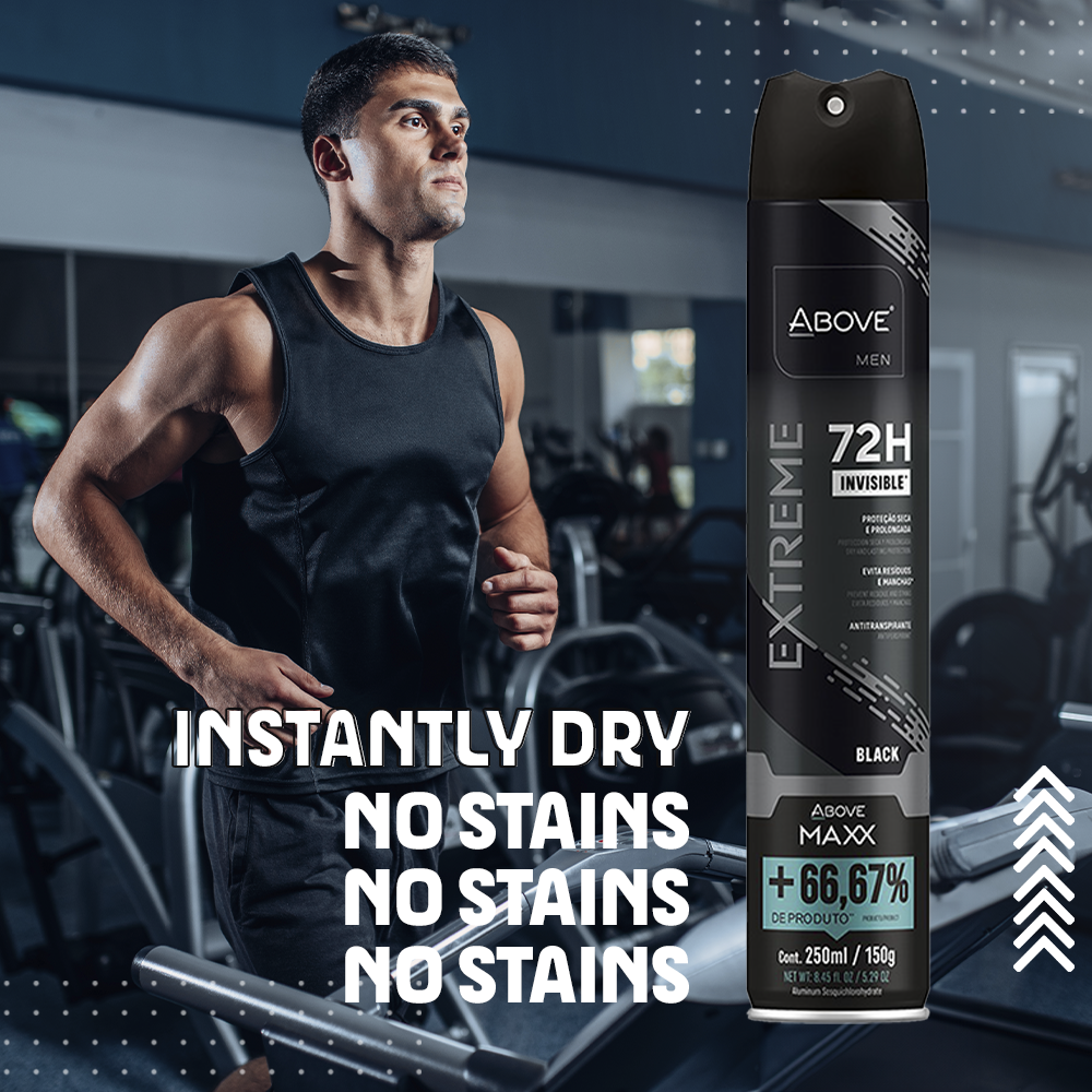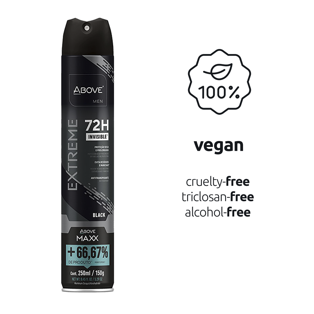 The Above Men Extreme Invisible Black Antiperspirant Spray offers effective protection against sweat and odor for up to 72 hours, providing security and comfort throughout the day. Its formula with dry protection helps keep skin fresh and comfortable, preventing visible residue and stains on clothing. It provides a long-lasting feeling of cleanliness and confidence, even during periods of high activity and physical exertion. Its application is light and even, ideal for the daily use of men seeking maximum performance, invisible protection, and continuous care.