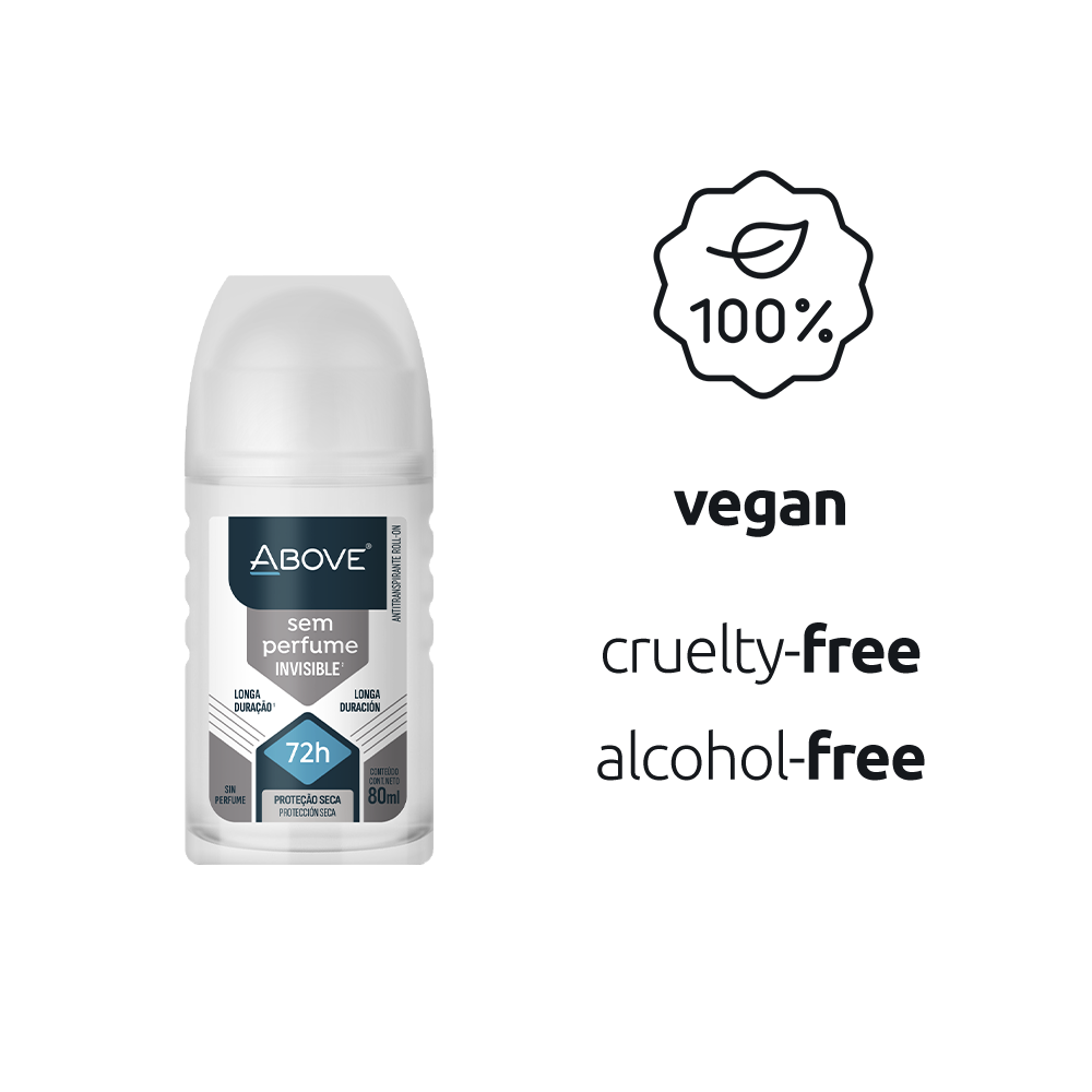 Maximum protection, fragrance-free. The Above Unscented roll-on is the ideal solution for those seeking 72-hour dry protection without interfering with their favorite perfume. Its advanced formula with Invisible Technology guarantees residue-free application and high efficacy against sweat, k.eeping you fresh and confident for longer. Clinically proven, long-lasting performance for everyday use.