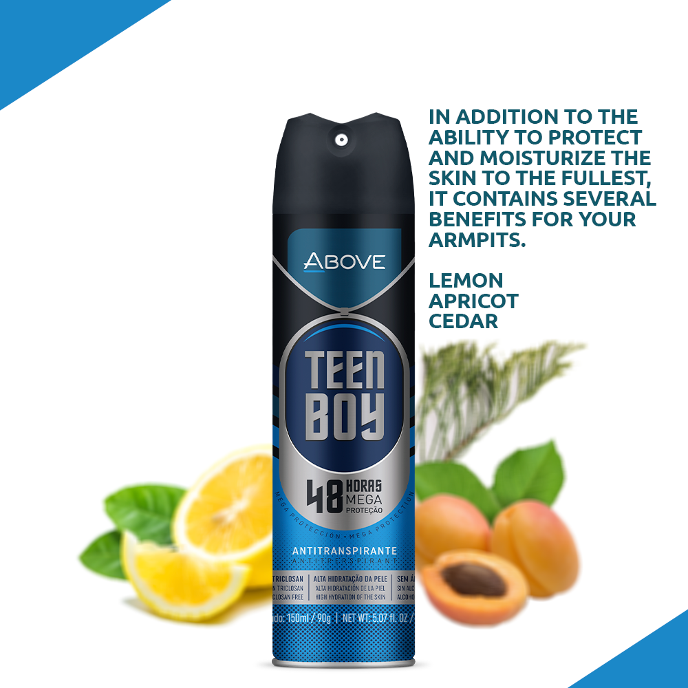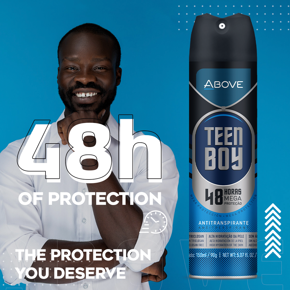 Get ready to embark on a mega-adventure with Above Teen Boy - the antiperspirant that protects for 48 hours and moisturizes the skin to the maximum. As well as containing vitamins, mineral salts and macadamia oil, its formula is free from alcohol and triclosan. Don't let the bad smell get to you, choose Teen Boy!